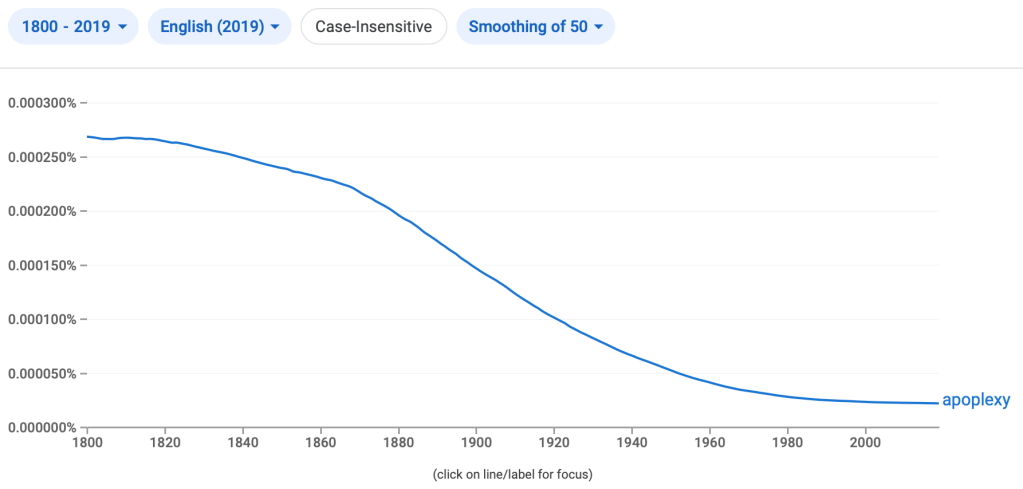 It’s unclear exactly which meaning Dumas was referring to in The Count of Monte Cristo, however it is worthwhile noting that he also uses the words apoplexy and apoplectic elsewhere in the text. At the risk of being side-tracked slightly, now is perhaps also the moment to consider what apoplexy means.